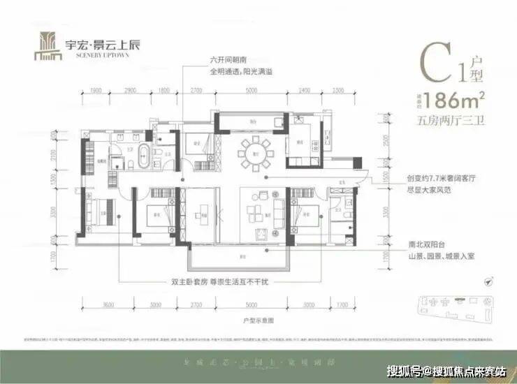 竖厅南北通透格局,客厅5米开间,六开间朝南,南北双阳台,分别做到了主卧22.42㎡/次卧11.7m²/次卧11.7㎡/次卧10.53㎡/次卧8.91㎡(含墙体飘窗),得房率约78.1%(不含赠送),主朝东南向。加上赠送后得房率约90.72%。