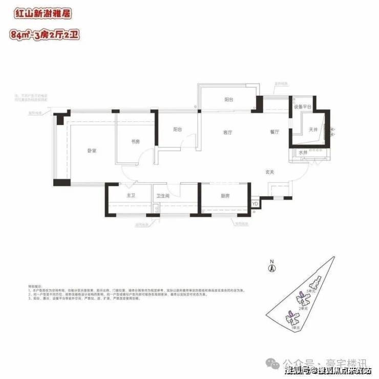 84㎡的3房2厅2卫,设计的是横厅南北通透格局,客厅3.4米开间,LDKG+X空间一体化,动静分区,主卧南北通设计,餐厅位带1个设备平台,U型厨房,卫生间干湿分离,得房率:100%(包含赠送),阳台东北朝向。