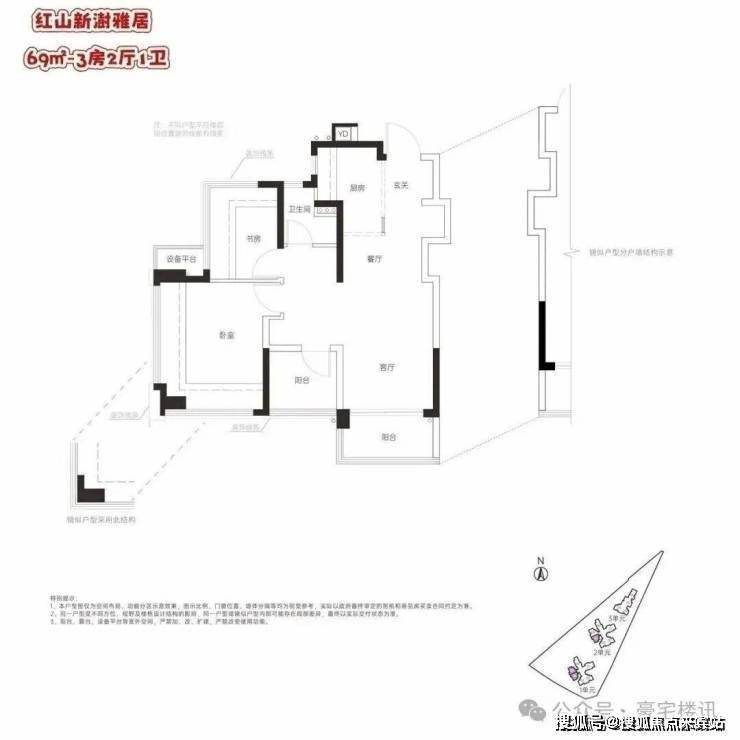 69㎡的3房2厅1卫,设计的是竖厅格局,客厅3米开间,LDKG+X空间一体化,S墙设计预留冰箱卡槽位,动静分区,三开间朝南,主卧+1个次卧都是双飘窗设计,次卧带1个设备平台放空调机位,U型厨房,卫生间三段式干湿分离,得房率:100%(包含赠送),西南朝向。