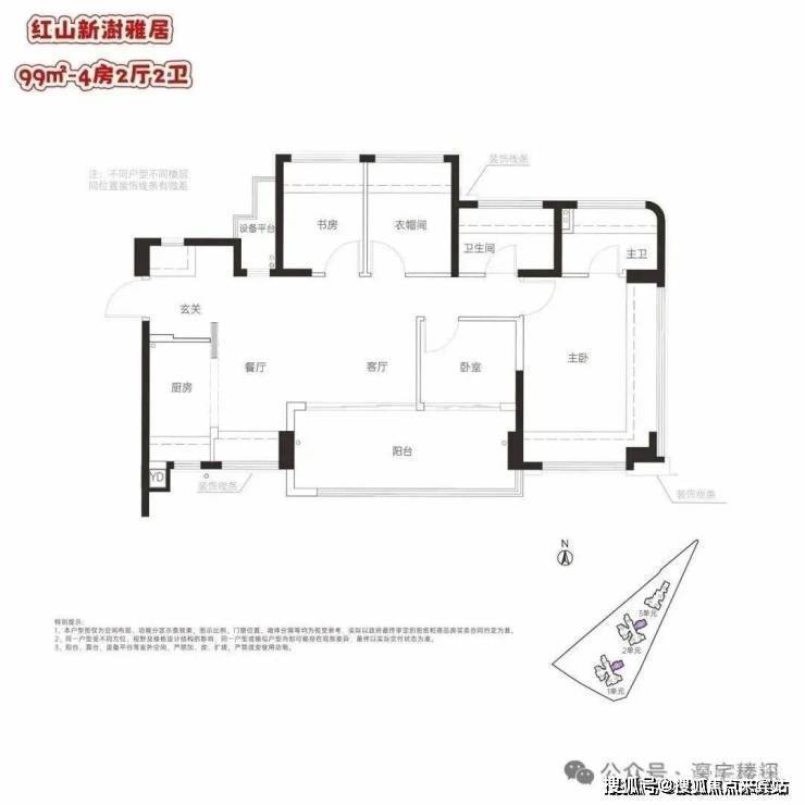 99㎡的4房2厅2卫,设计的是横厅南北通透格局,客餐厅5.35米开间,LDKG+X空间一体化,进门独立入户玄关,五开间朝南,主卧大套间设计,餐厅位带1个设备平台,U型厨房,卫生间干湿分离,得房率:100%(包含赠送),阳台东南朝向。