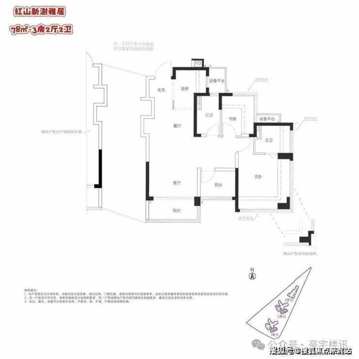 78㎡的3房2厅2卫,设计的是竖厅格局,客厅3.4米开间,LDKG+X空间一体化,S墙设计预留冰箱卡槽位,动静分区,三开间朝南,主卧+1个次卧都是双飘窗设计,次卧带1个设备平台放空调机位,U型厨房,卫生间干湿分离,公卫带1个设备平台可日常使用,得房率:100%(包含赠送),西南或东南朝向。