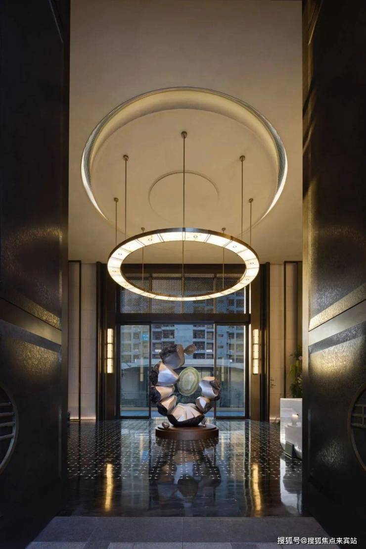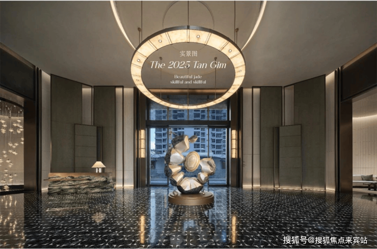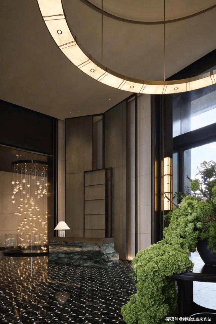 皇家白玉的仪式感:归家环岛前庭中央,整石切割的皇家白玉发光圆盘,形似平安扣,寓意“财运亨通”;7米高黄铜大门左右矗立四幅皇家白玉玉璧,晨光漫溢时,温润玉泽如神鹿衔星坠入凡尘。