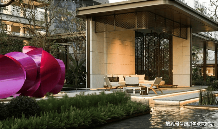 移步社区精心设计的“玉榭”庭院会客场景,精雕定制方胜纹格栅若隐若现,与《玉夏花漾》艺术作品共同营造花林水院间的隐奢意境。