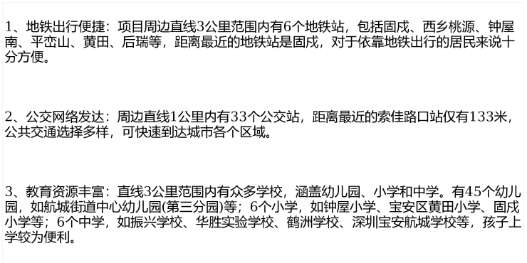 干道:紧邻宝安大道、107国道等主要干道,自驾出行时,可以快速接入高速公路网络,轻松到达深圳周边城市。