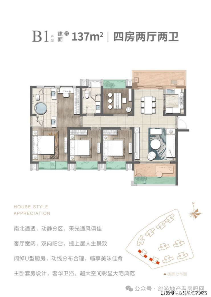 B1户型:建筑面积约137㎡,套内面积约109.76㎡,阳台面积约7.8-8.8㎡,四房两厅两卫。