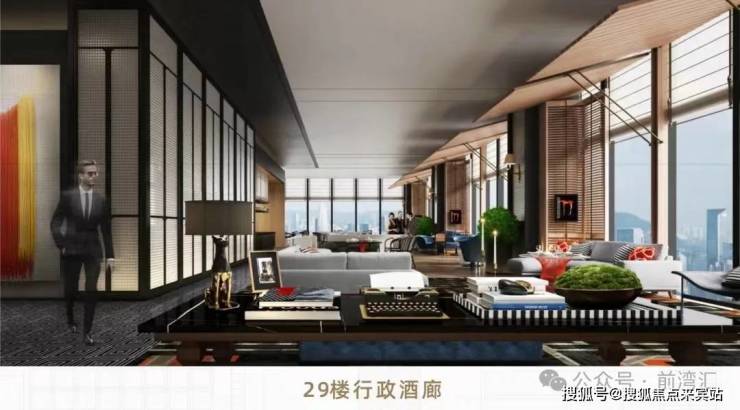 设计将行政酒廊布置于酒店顶部,在天际行政酒廊可俯瞰前海湾璀璨盛景,顶部的架空层将自然景观引入,提供层次丰富的观景空间体验,塑造项目的标志亮点。