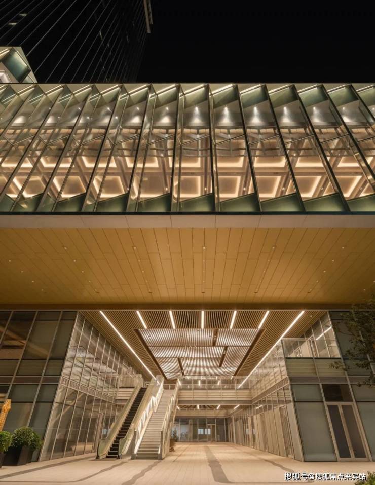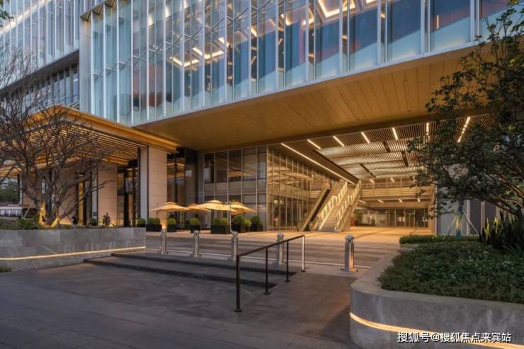 酒店低区大跨度折线玻璃幕墙是项目一大亮点,得益于此空中大堂及酒店宴会前厅拥有两层通高的空中通透视野,结合充满艺术气息的大堂吧以及露台花园带给客人非凡的入住体验,夜间两个通透的折面玻璃犹如悬浮的水晶体一般引人注目。