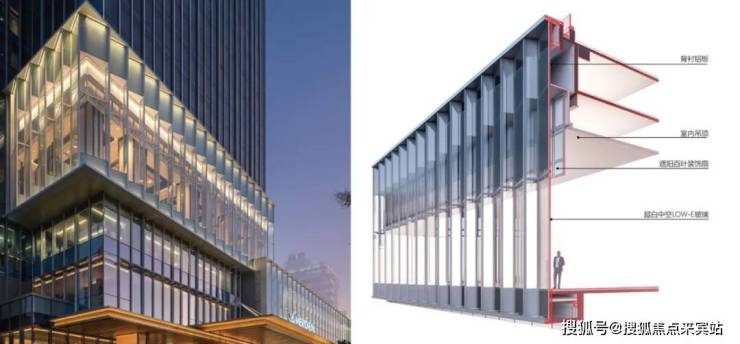 折线玻璃幕墙不仅跨度大,高度也高达13米左右,有别于常规幕墙可以明显看见竖向横向等金属杆件、拉索或玻璃肋受力构件,本次幕墙设计中创新的将大跨度折面玻璃本身作为受力构件,因此能达到更为通透的幕墙效果,同时对折线幕墙的玻璃材料与层间型材进行施工工艺创新,保证了幕墙系统的刚度和完成立面效果,并结合灯光与室内遮阳考虑,形成实用且独特水晶体立面效果。