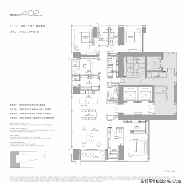 面积设计:300、400、460、570、1000平米纯粹大户型,空间方正,极致私密。
