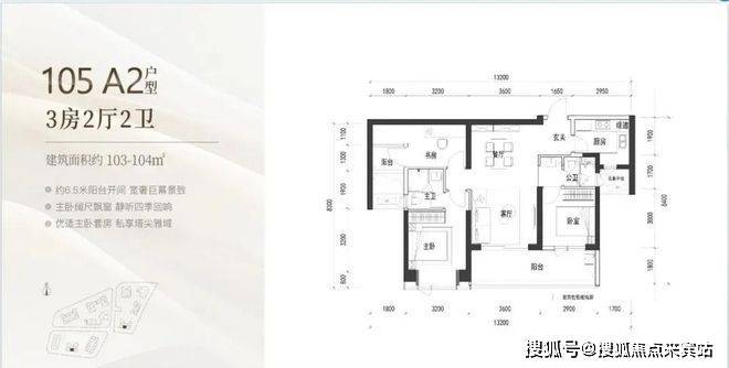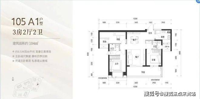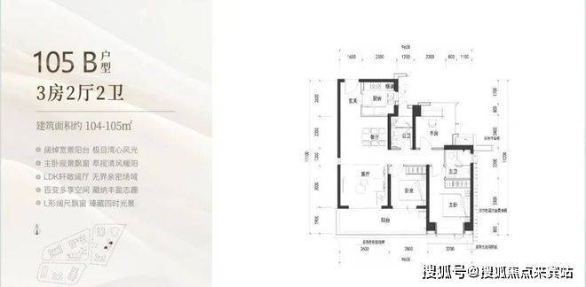 105㎡:竖厅格局,客厅与卧室连通超大阳台,LDK一体化设计,主卧室270度转角飘窗,看城市景观,主要朝向为西南和东南