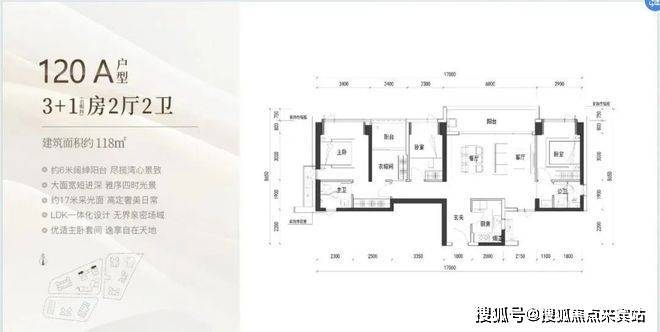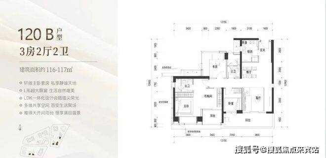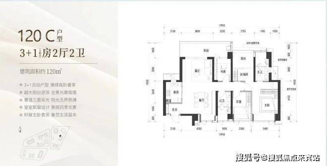 120㎡:客厅与卧室连通9.6㎡超大阳台,主卧带5.2㎡衣帽间,还有观景小阳台,主要为东南和西南朝向