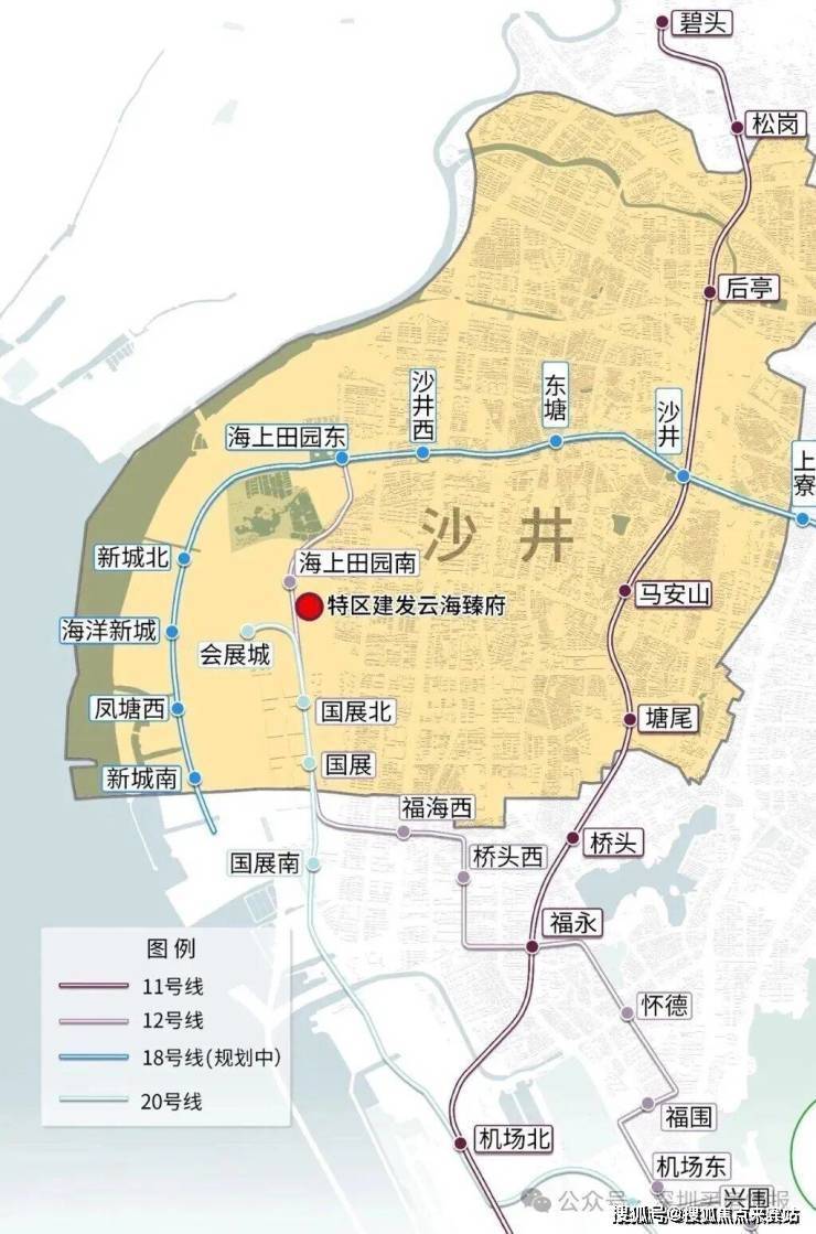 云海臻府项目位于深圳市西部宝安区沙井国际会展中心片区(宝安区沙井街道展景路一侧)深圳西北部,受深圳国际会展中心、海洋新城两大重要规划包夹。区域以东为沙井先进制造业集合区,向北跨越海上田园为东莞滨海湾新区。双重价值辐射,执掌湾区的厚实产业基底全球最大国际会展中心,百场展贸赋能,聚合千万人流及千亿效益。总占地面积约148万㎡,相当于1/3福田,距离项目仅1km,直接承接会展新城发展利好。
