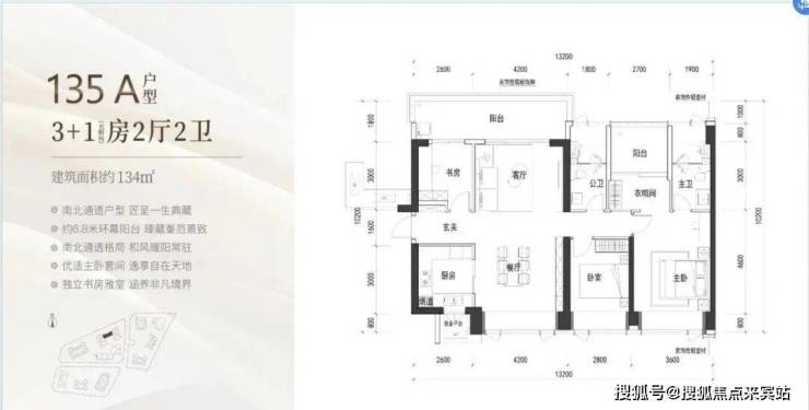 135㎡:横厅格局,南北双阳台设计,9.8㎡南向主阳台,三个房间面积分别达到9/11/15㎡,主卧带衣帽间和卫生间,舒适度非常好。