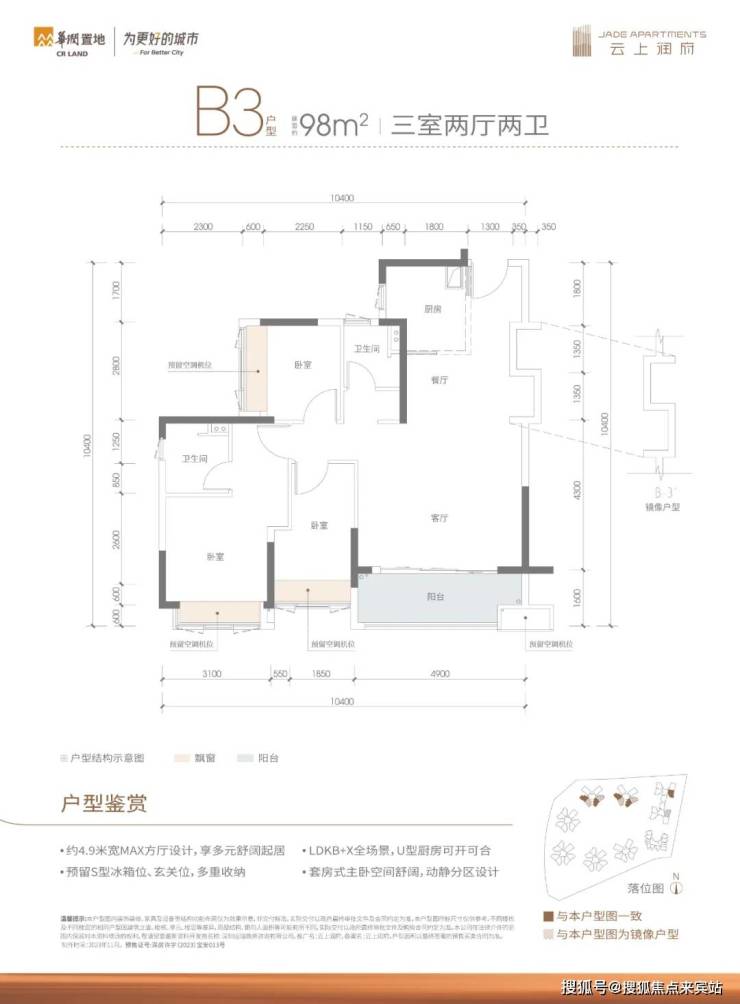 98㎡的3房2厅2卫,B3户型,设计的是MAX方厅,客厅4.9米开间,LDKB一体化+X全场景,S墙设计预留冰箱卡槽位,3个卧室分别做到了3.1米/2.8米/2.4米的宽度,U型厨房,公卫三段式分离设计,得房率83.95%(不含赠送),有西南或东南朝向。