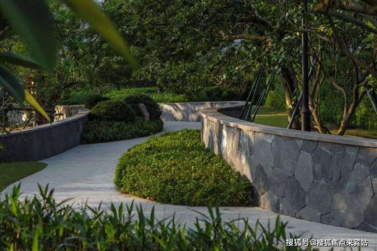 山脉的肌理,林樾的肌理,石墙的质感,无一不在诉说场地故事。片石围墙结合夹道植物,形成整齐简洁的秩序感,惬意漫步,曲径通幽,斑驳树影投映地面,犹如描摹一幅山水画卷。