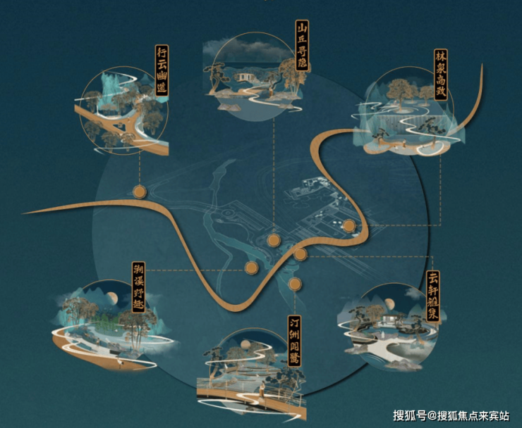 项目以“自然里的居游画境”作为主题寻找设计元素,以呈现画境主题的手法,以场地自然山水为笔,融合现代的创新手法,打造一处城市中的云溪秘境,在江畔边上通过简单明朗的动线,从视觉、感觉、听觉多维感知别样的山水诗意画境。