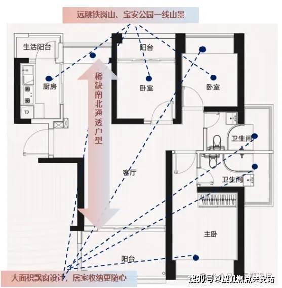 阳台阔绰:前海稀缺在售89㎡三房两卫三阳台,客厅阳台进深1.9米,揽收城园双景