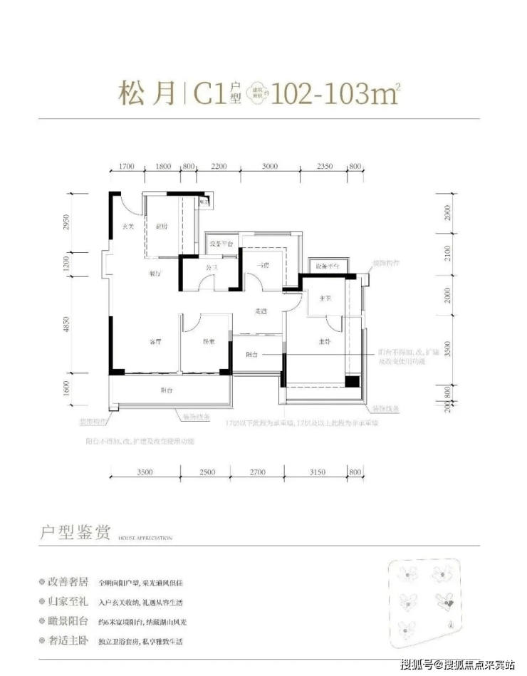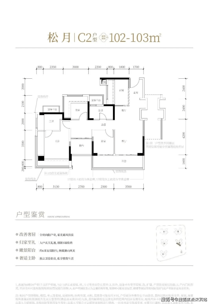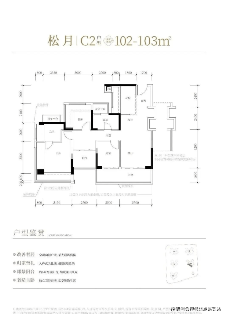 102-103㎡的4房2厅2卫(C1-C2户型),设计的是经典竖厅格局,进门入户玄关,客厅3.5米开间,LDKB一体化,S墙设计预留冰箱卡槽位,动静分区,四开间朝南,4个卧室分别做到了主卧17.98㎡/次卧8.37㎡/次卧8.1m²/次卧7.75㎡(包含墙体飘窗),L型厨房,公卫干湿分离带1个约2m²的设备平台,得房率约81%(不含赠送),客厅连接次卧出9.6m²的观景大阳台,东南或西南朝向。套内面积83.43m²+赠送面积23.86m²=实际使用面积107.29m²,加上赠送后得房率约104.16%。
