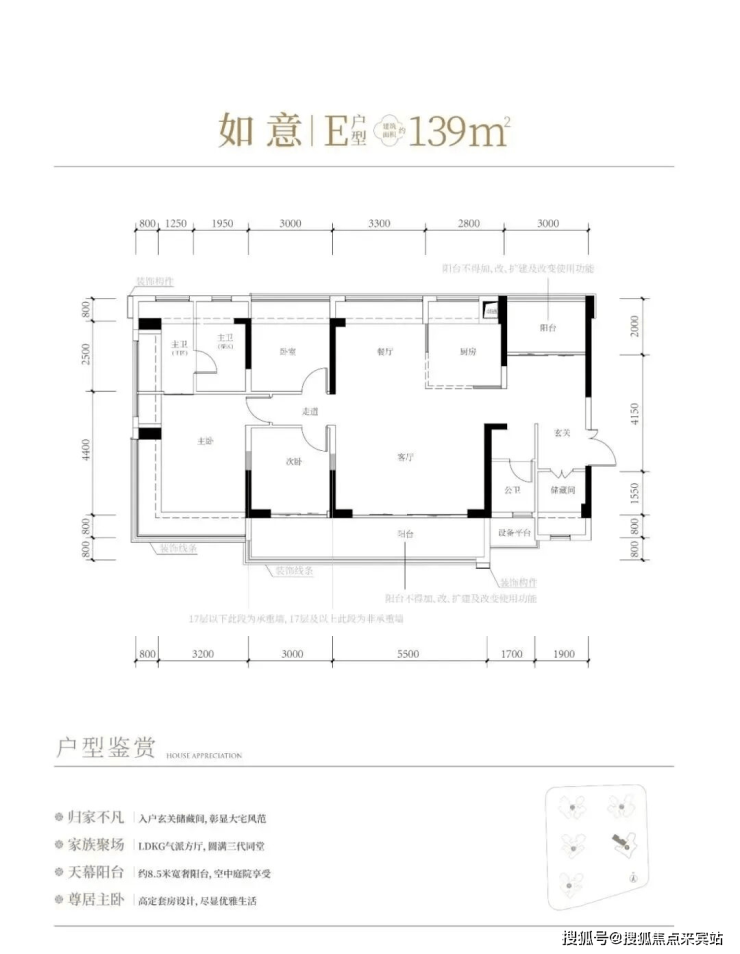139㎡的4+1房2厅2卫,设计的是竖厅南北通透格局,进门赠送约5.2㎡的入户玄关(不计算在户型图内),客厅5.5米开间,LDKB一体化方厅设计,5个卧室分别做到了主卧27.56㎡/次卧10.2m²/次卧9.9㎡/次卧9.9㎡/次卧4.46m²(包含墙体飘窗),L型厨房,得房率约81%(不含赠送),客厅连接次卧出13.6m²的观景大阳台,主朝西南向。套内面积112.59m²+赠送面积31.98m²=实际使用面积144.57m²,加上赠送后得房率约104.01%。