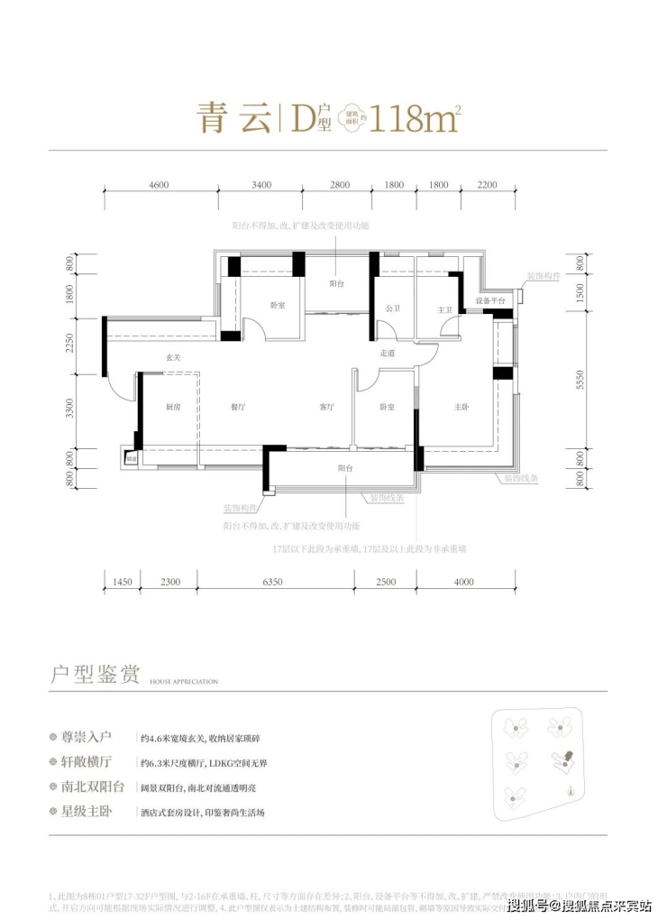 118㎡的4房2厅2卫,设计的是横厅南北通透格局,进门赠送约4.6㎡的入户玄关(不计算在户型图内),客餐厅6.35米开间,LDKB一体化设计,4个卧室分别做到了主卧22.5㎡/次卧11.56m²/次卧9.52㎡/次卧8.25㎡(包含墙体飘窗),主卧带设备平台,客厅连接次卧出6.25米长大阳台,L型厨房,得房率约81%(不含赠送),阳台主朝东南向。套内面积95.58m²+赠送面积31.04m²=实际使用面积126.62m²,加上赠送后得房率约107.3%。