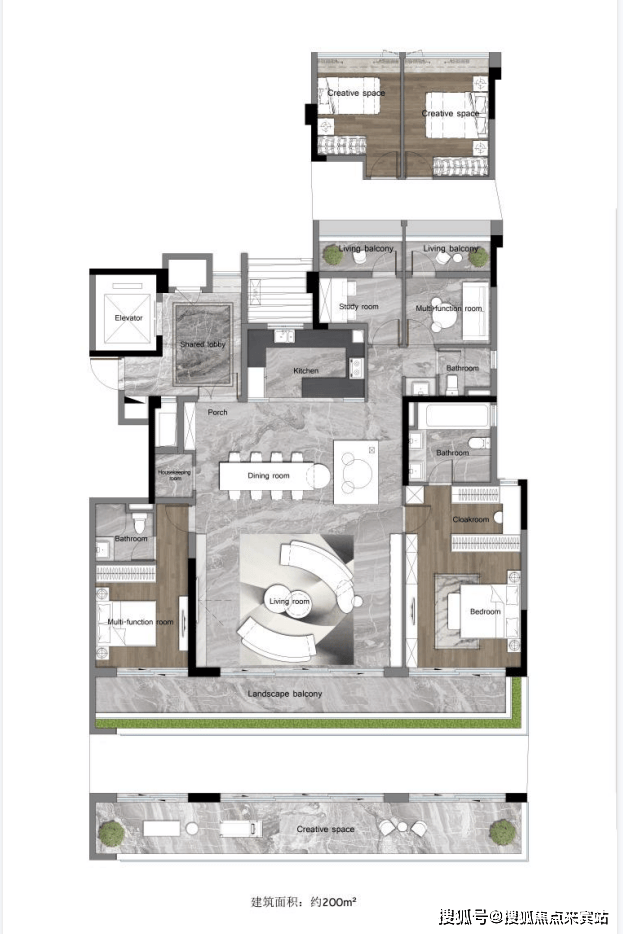 另一建面约200㎡的四房,也是专梯入户,且配置了约14米的四面宽阳台,可连通主次卧以及客厅,这在豪宅产品中是比较少有的。