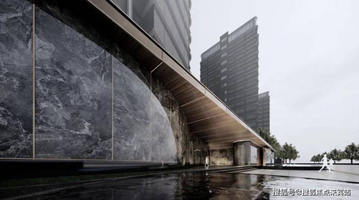 塔楼立面采用横向弧线金属设计,深灰色纵向装饰铝板强调出建筑的垂直线条以及体量感,整体勾勒出现代精工、新锐典雅的气质。大面积通透的玻璃使整个建筑轻盈而优雅,创造良好的景观视野。顶部以简单的手法,为建筑创造了丰富的形体变化,构建出沿河的标杆形象。