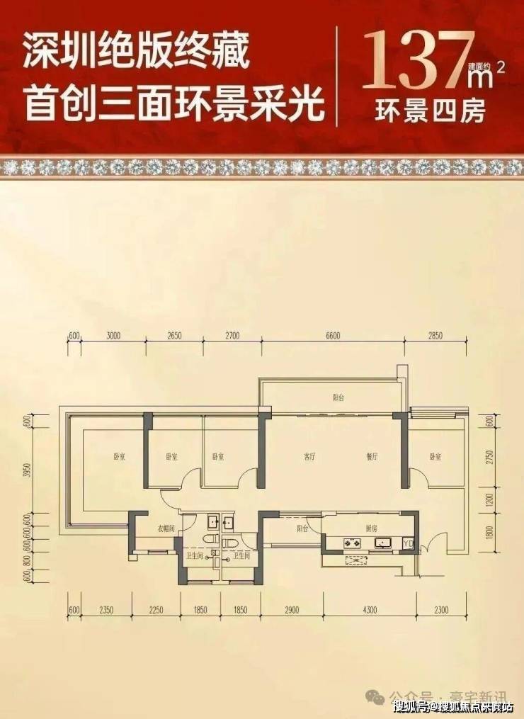137㎡4房2卫户型:新品大户型,阔绰玄关,大横厅双阳台南北通透,主卧罕见U型窗设计,三面采光,全屋飘窗赠送,约93%超高实用率。