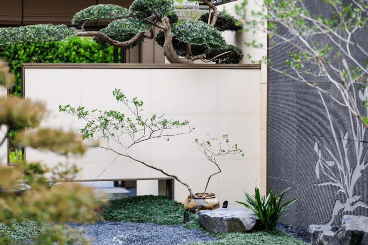 光是约200-350㎡的首层花园,尺度就足以让人惊叹。正方摒弃夸张的堆砌,借景天地自然,将名贵树种、观景鱼池、茶艺室等元素融入其中,极具美感与意韵。