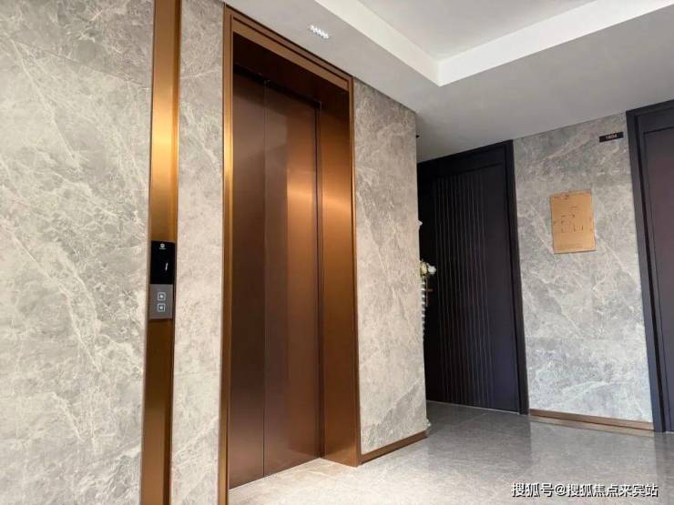 公区匠心细节打造,隐贵不彰自显。现代轻奢电梯采用鱼肚金岩板,华丽尊贵。