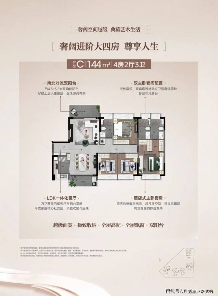 建面约119-144㎡的奢装宽宅,以港式美学精装标准,实现空间越级。全屋配置西门子(或同等档次品牌)厨房三件套、格力(或同等档次品牌)空调、全屋品牌定制柜体交付,采用中空low-e双层隔音玻璃,提质东莞东人居生活。