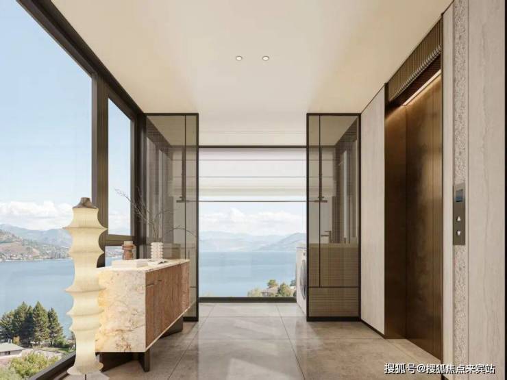 立面萃取山海意境,以玻璃+铝板线条勾勒度假美学,让建筑消隐于自然之中。两梯两户通透格局,确保户户视野开阔,实现视觉的无界延伸。