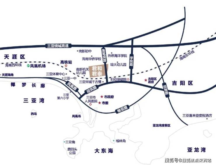 项目南侧紧邻三亚迎宾路中央商务区(三亚CBD),也是三亚城市发展的黄金命脉,向南行驶5分钟即达。北侧是三亚新城市主干道鹿城大道,东西贯通了三亚市北部经济,现已全线建完成,由此向东可直线达三亚机场。项目向北距环岛高速路仅800米, 7公里内覆盖2个高铁站,30分钟内可到达三亚湾、大东海、亚龙湾、海棠湾四大湾。除了便捷的交通路网外,园区门口的公交线路也是十分方便,可以方便的到达市区的任何地方。