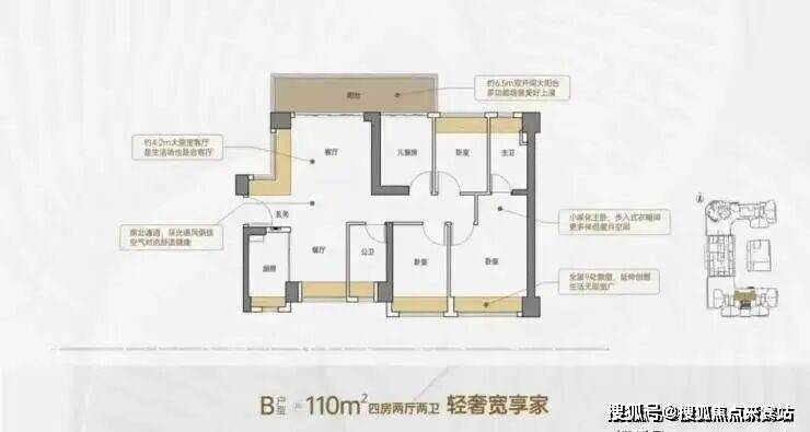 B户型-约110㎡4房2厅2卫:户型分布在1、2单元,竖厅南北通透格局。