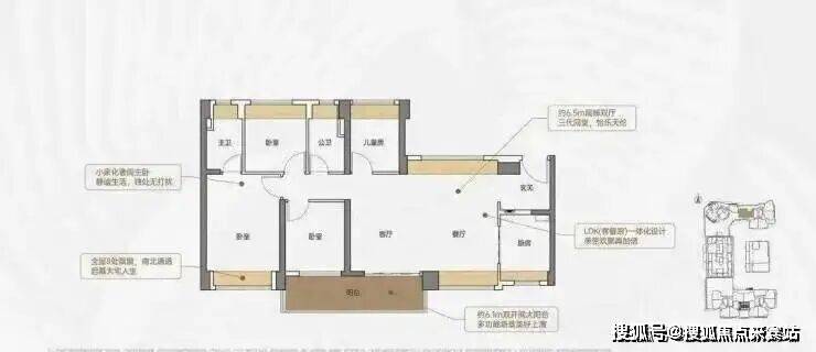 竖厅格局,客厅3.5米开间,LDKB一体化,S墙设计预留冰箱卡槽位,客厅连接次卧出5.9米长的大阳台,主卧双面飘窗,次卧270°转角飘窗,全屋6面飘窗,U型厨房,卫生间干湿分离。