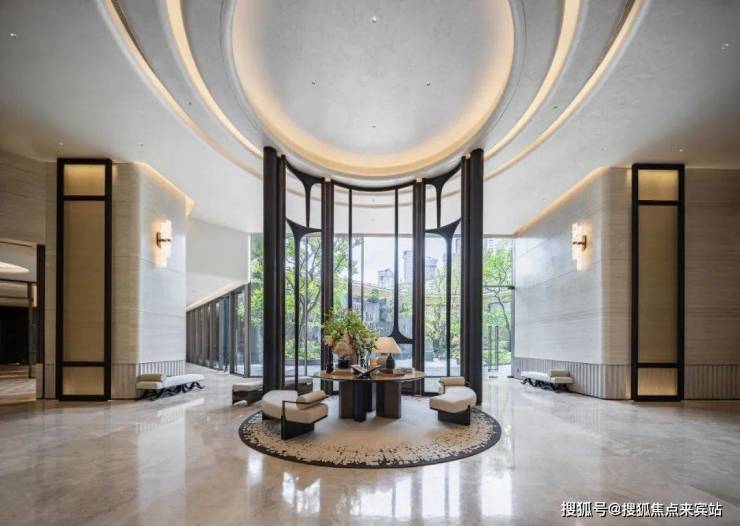 前庭作为社区入口,以车行落客为主,注重空间仪式感。设计采用星级酒店环岛落客设计,利用洄游动线,实现车辆高效出入。落客区顶部采用顺延地面车道弧线的金属带状灯槽,天花光线随着行驶路径闪耀,如灵动的飘带引领归家之路,为业主营造出极具尊崇感的归家仪式。