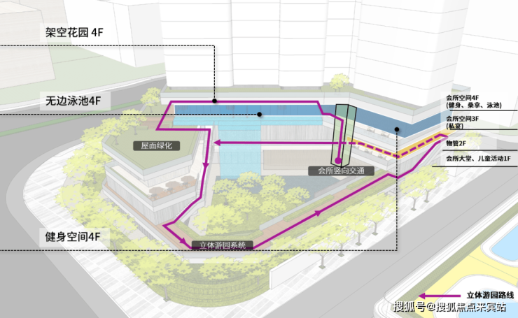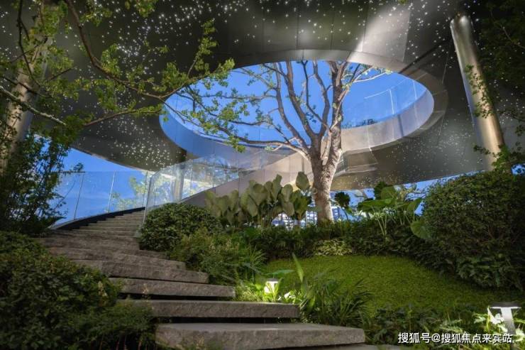 后院以游园休闲为主,设计通过将东南侧形体打开以引入立体园林,与城市界面形成呼应,借助形体减法的手法,生成退台及架空空间,并在此基础上打造空中花园及屋面绿化,以此实现多层次立体空间的营造,提升住区园林品质。