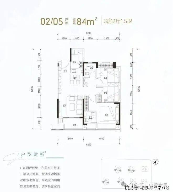 建面约84㎡是传统竖厅动静分区格局,客厅进深7.55米(不含阳台),开间3.4米,主卧8.4㎡(不含主卫和飘窗),空间确实会偏紧凑一点,但没什么硬伤,实用性还是非常不错的。