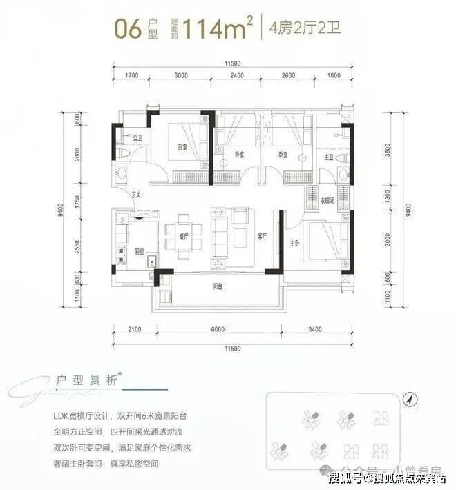 建面约114㎡是传统短进深大开间横厅格局,通透性很好,客厅进深6米,开间4.3米(不含阳台),配有6米宽景阳台,主卧套间设计,配衣帽间和三段式卫生间,这个户型很比较讨喜年轻的购房群体。