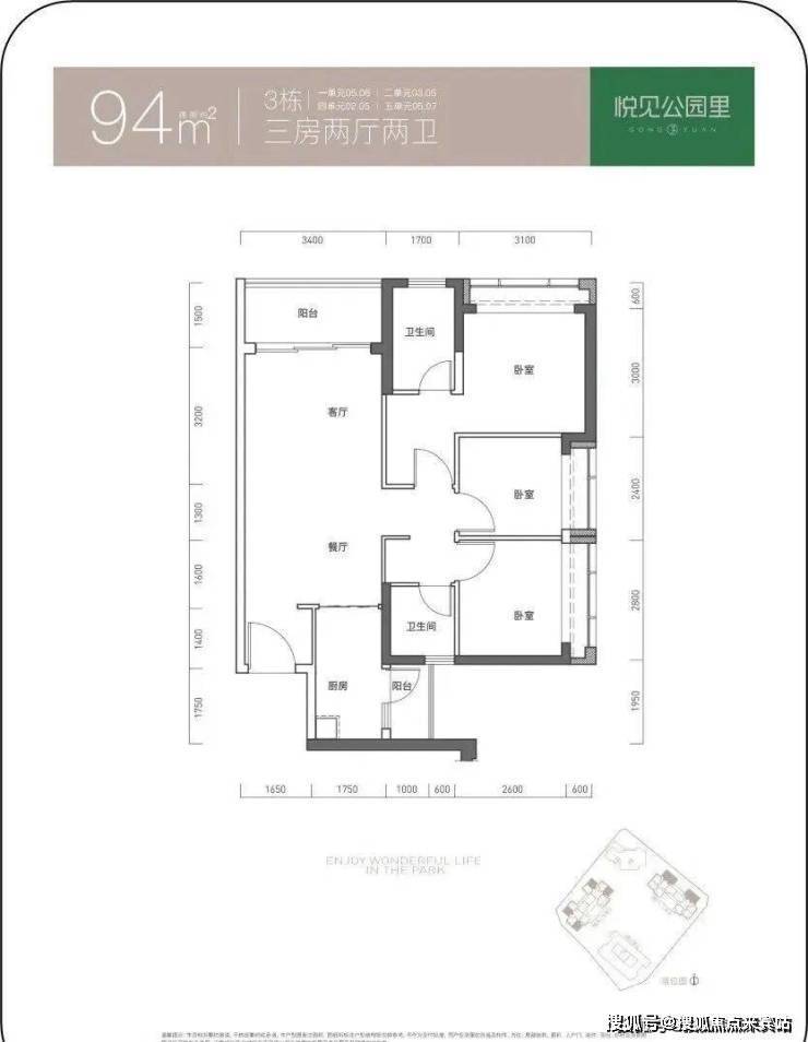 95㎡的3房2厅2卫,仅3栋1单元01户型,设计的是竖厅双龙抱珠格局,客厅3.4米开间,三开间朝南,3个卧室分别做到了3.2米/2.8米/2.3米的宽度,L型厨房带1个生活阳台,公卫三段式分离,得房率73.71%(不含赠送),西南朝向。
