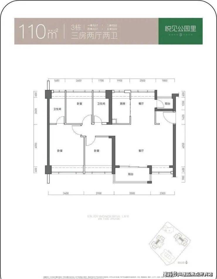 110㎡的3房2厅2卫,设计的是横厅大开间格局,客厅5.8米开间,南北通透双阳台,三开间朝南,3个卧室分别做到了3.4米/2.9米/2.6米的宽度,U型厨房,公卫三段式分离,得房率73.71%(不含赠送),阳台主朝西南或东南向。