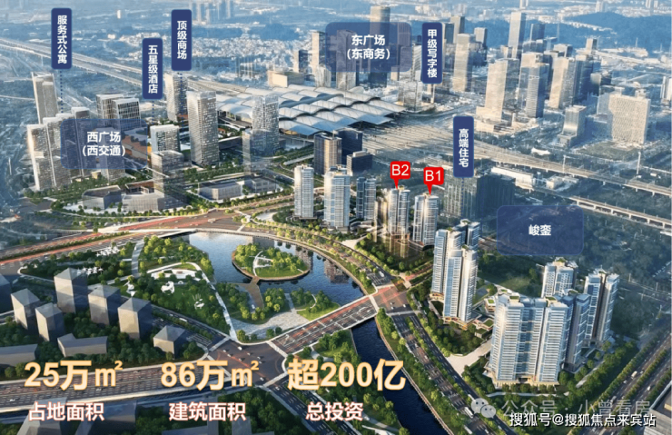 项目介绍:总用地面积约为25.1万㎡,总建面约86万㎡,总投资超200亿