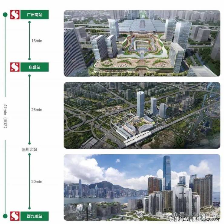 广深港高铁上汇聚新鸿三大TOD地标巨作(南站ICC-庆盛枢纽TOD-西九龙高铁站上盖发展项目),一轨之上港穗互联,比肩世界,实现双核驱动赋能发展。