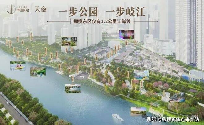 位置上,岐江新城核心、起湾道和濠江西路交汇处,北侧是岐江河、滨江公园和艺术中心,低头饱揽东区约1.2公里江岸线和公园全景风光。