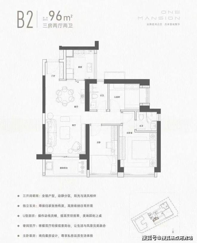 建面约96㎡的3房2厅2卫,三开间朝南,采光通风极佳。客厅实际使用面积做到了约22㎡,奢阔客餐竖厅衔接观景阳台,空间尺度更大。健身阳台的设计,更符合未来人居健康需求,平时练练瑜伽,做做体能,喝茶、品酒,与阳光、清风相伴,尽享惬意生活。