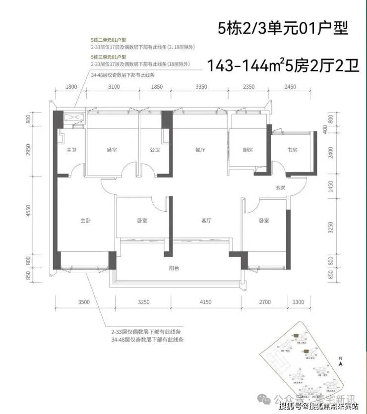 【五栋三单元-平面图】3梯4户,4条腿,跟二单元的户型产品一模一样,01号房户型约144㎡的5房2厅2卫,02、03号房户型约96㎡的3房2厅2卫,04号房户型约115㎡的4房2厅2卫。