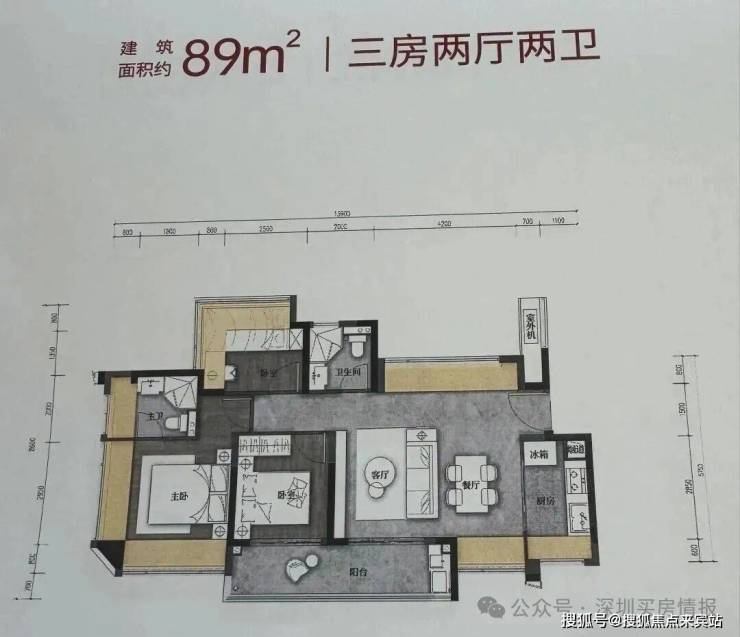 89㎡的3房2厅2卫,设计的是竖厅格局,客厅3.4米开间,LDKB一体化,S墙设计预留冰箱卡槽位,3个卧室分别做到了3.9米/2.9米/2.6米的宽度,客厅连接次卧出6.3米长的大阳台,L型厨房,卫生间干湿分离,有西北、西南或东南朝向。