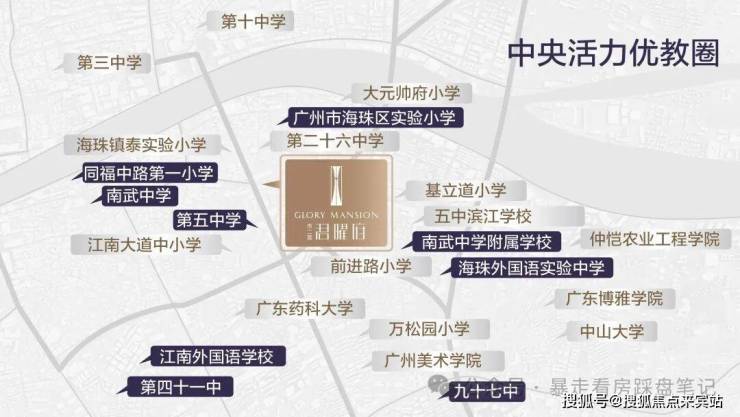 对口海珠区实验小学(省一级第一梯队),小升初对口五中/六中/南武中学等名校(王牌第四组),500米内30余所学府环绕,划定“中央活力优教圈”,开启海珠菁英教育新时代。(学校片区划分来源于2025年海珠教育局公示,具体招生政策以当年教育局公示为准。)