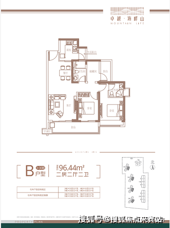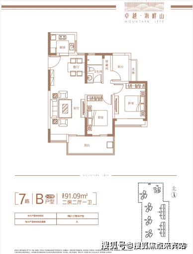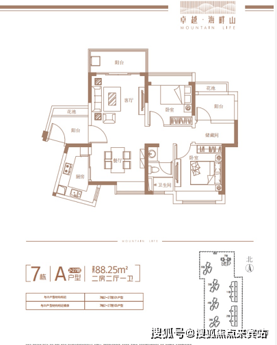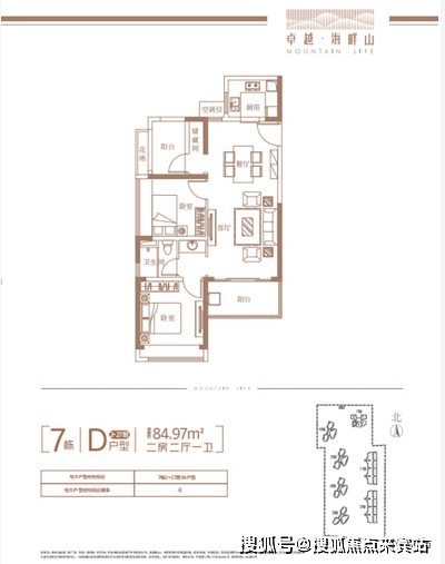 ①无走道,不浪费面积;③主卧正南朝向看花园;④次卧观望山景;⑤私密性好;⑥面积虽小,餐厅客厅开间都约3.6㎡;⑦片区84.97㎡高使用率空间
