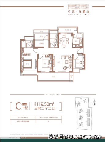 ①主卧开间3.2米,预留了主人房衣帽间;②入门处设玄关,预留鞋柜;③主卫、客卫预留了窗户,保证了通风采光;④次卧飘窗可以观望山景;⑤前后无遮挡,私密性好;⑥7米阔尺生活阳台,3.9米观山景阳台,双阳台设计;⑦高使用率空间,三代同堂居住