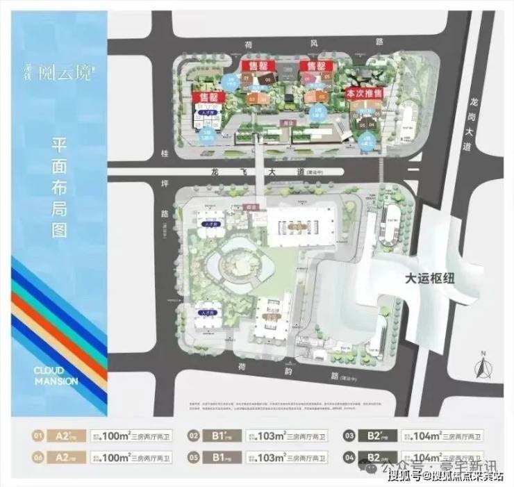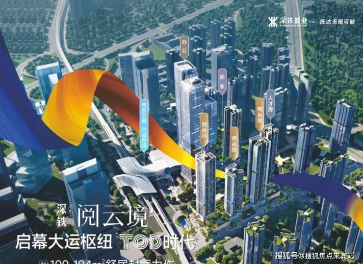 位于深圳龙岗区大运新城园山街道,龙飞大道与龙岗大道交汇处,是大运枢纽上盖的大型 TOD 综合体;由国企深铁置业开发、深铁物业运营(物业费 4.5 元 /㎡・月)。项目分南北两期(空中连廊互通):北区为住宅(3 栋商品房 + 1 栋人才房),南区为超高层写字楼 + 大型商业 MALL;容积率 6.1,绿化率 40%,总户数 837 户(商品房 591 户),车位比 1:1.15;预计2026 年 12 月 30 日精装交付;主力户型 96–106㎡三房两卫、112–115㎡四房两卫,2026 年 3 月折后均价约 4.55 万 /㎡。
